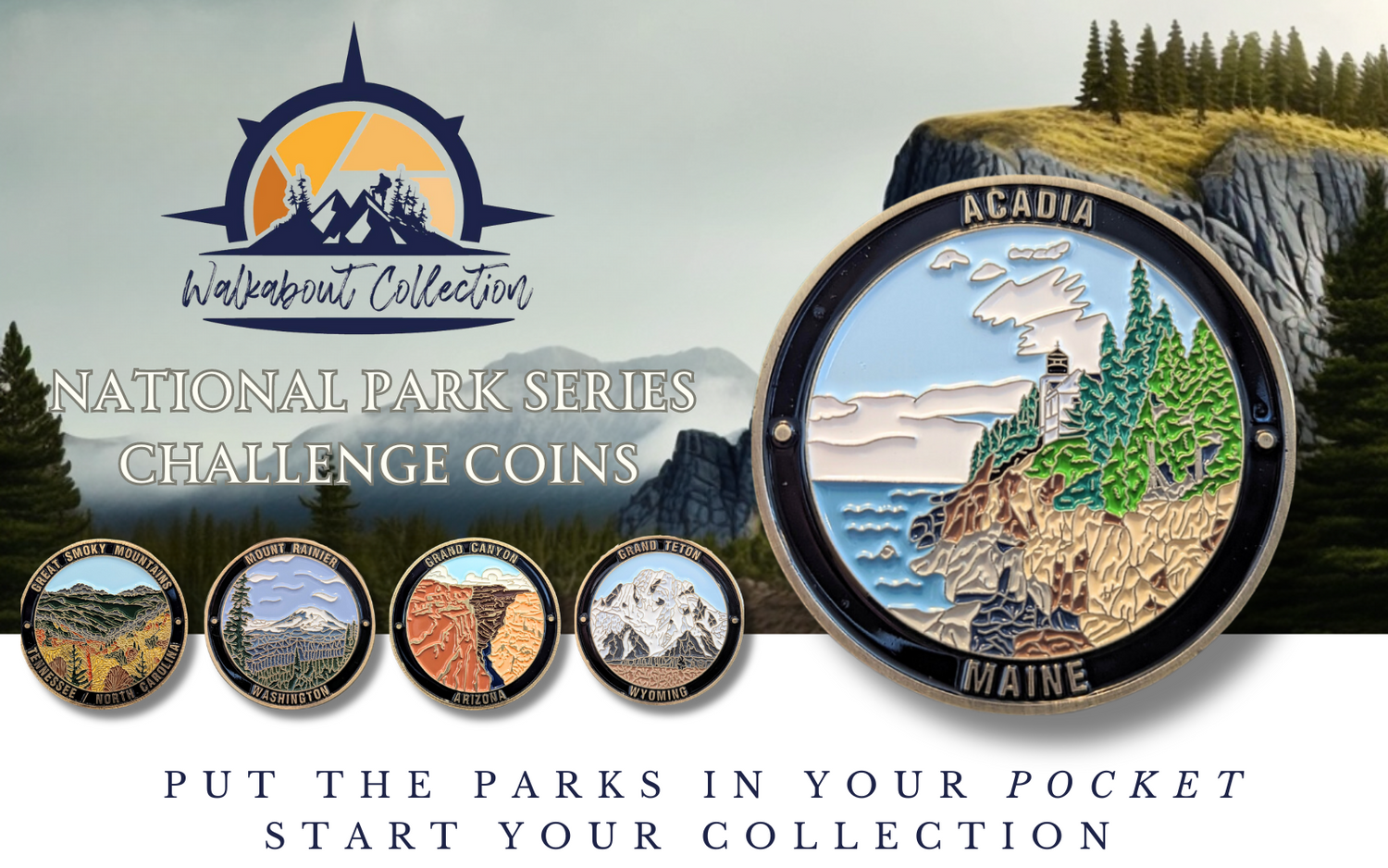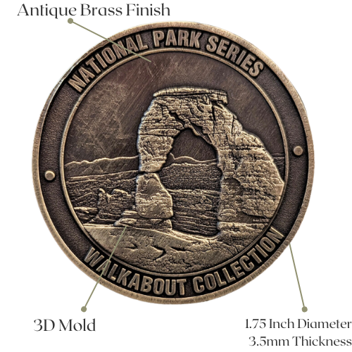 At Walkabout Collection, we believe that every detail matters when it comes to capturing the essence of our magnificent national parks. That's why we take pride in inscribing the park name prominently at the top of each coin. When you hold one of our challenge coins, your connection to the park is immediately apparent. Whether it's the majestic Yosemite, the untamed beauty of Denali, or any of the other 63 parks in our collection, the park's name serves as a reminder of the breathtaking landscapes and incredible experiences that await those who have or will venture into these natural wonders. This inscription isn't just a label; it's a tribute to the park's unique identity and a nod to the explorers and adventurers who have tread its paths. It's a way for you to carry the park with you, to share its story, and to inspire others to embark on their own journey of discovery. So, with our coins in hand, you're not just holding a piece of metal; you're holding a piece of the park itself, a tangible link to the beauty and wonder of these national treasures.