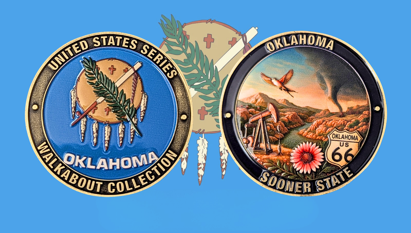 Commemorate the proud heritage of Oklahoma with this striking State Challenge Coin. One side features the official Oklahoma state flag, with its Osage shield, olive branch, and peace pipe symbolizing unity and strength. The reverse side highlights some of the Sooner State’s most iconic emblems: the Scissortail Flycatcher in flight, a symbol of grace and energy; the rugged Wichita Mountains; and an oil derrick, honoring the state’s historic role in energy production. Completing the design are red dirt terrain and tall prairie grasses beneath a dramatic stormy plains sky, a nod to Oklahoma’s sweeping landscapes; a small Route 66 sign, celebrating its place along the Mother Road; and the bright Indian Blanket flower, the state’s floral emblem. Crafted with precision and finished in antique detail, this coin captures Oklahoma’s heritage, culture, and pride. A timeless keepsake, perfect for travelers and collectors.